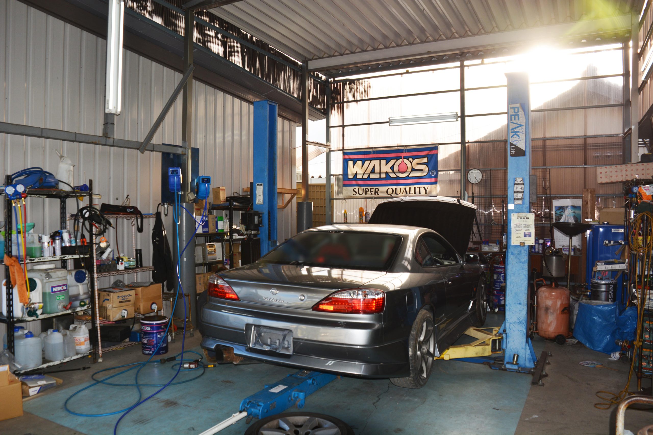 新設の屋根付き整備場リフト完備で悪天候の時でも作業可能です!オイル交換などでもお気軽に御来店ください!